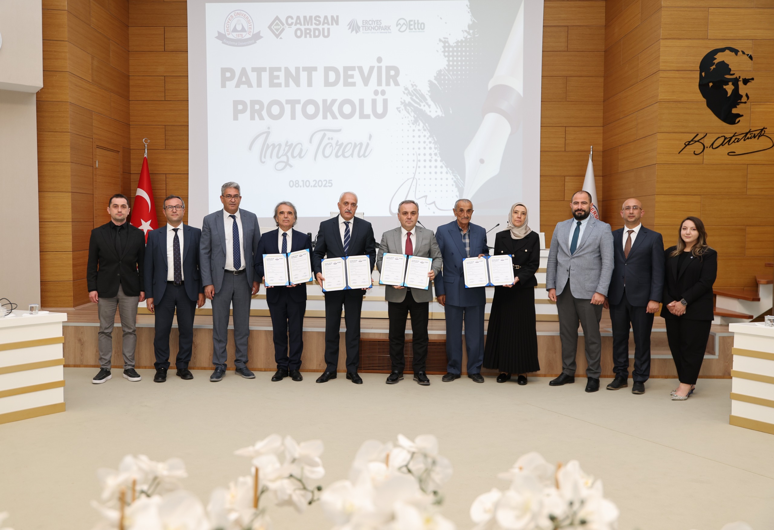 Rektörlük Senato Salonu’nda düzenlenen devir törenine; ERÜ Rektörü Prof. Dr. Fatih Altun, Rektör Yardımcısı Prof. Dr. Oktay Özkan, Genel Sekreter Prof. Dr. İbrahim Narin, Teknopark Genel Müdürü Serhat Dalkılıç, Çamsan Ordu A.Ş Yönetim Kurulu Üyesi ve Yönetim Kurulu Başkan Vekili Sedat Aksakallı, Çamsan Ordu Ar-Ge Koordinatörü Mehmet Erel, buluş sahipler Prof. Dr. Ayşe Benk ve Prof. Dr. Abdullah Çoban katıldı.