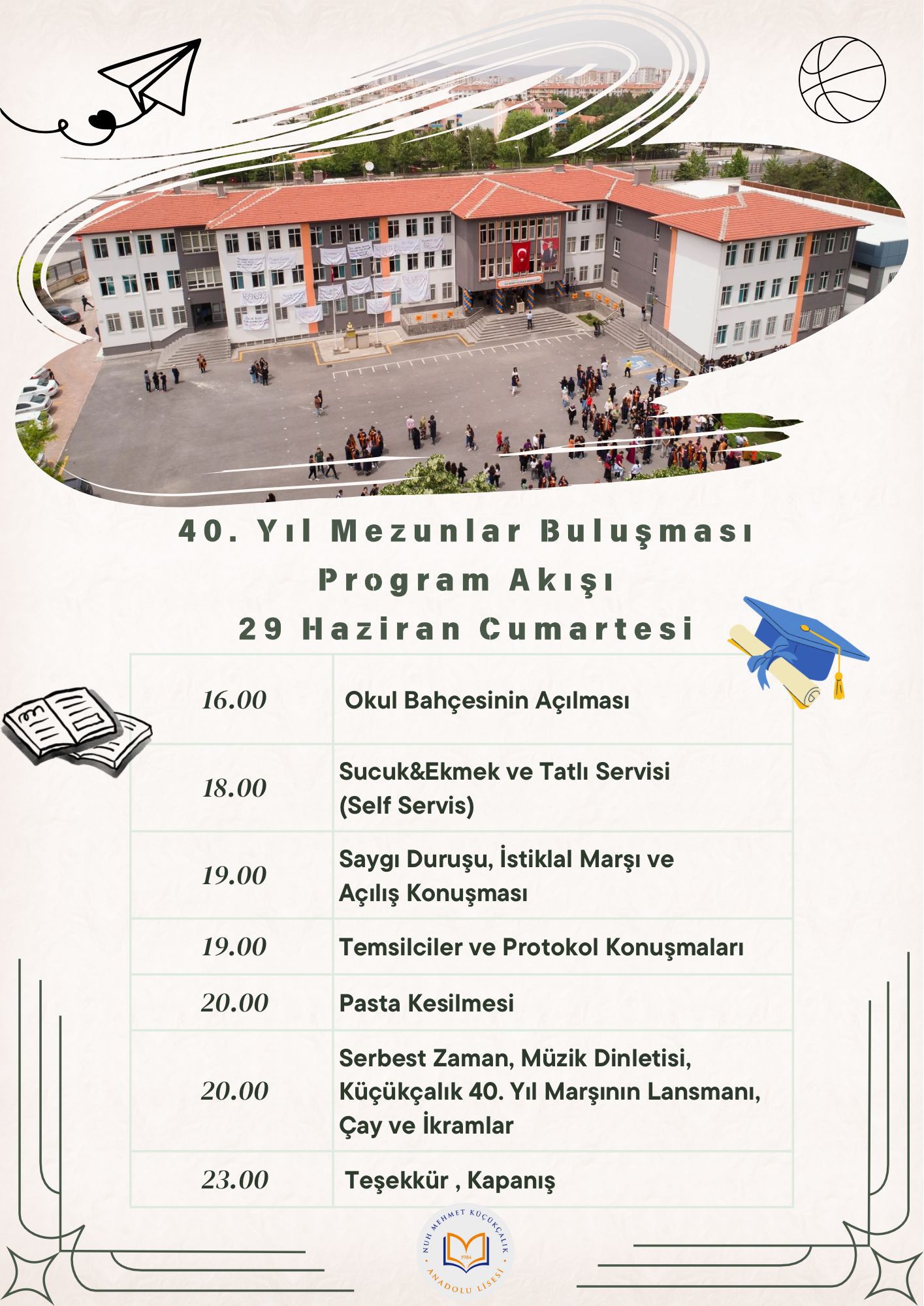 KAYSERİ (1HA)- Kayseri’de eğitim veren Nuh Mehmet Küçükçalık Anadolu Lisesi, 40’ıncı yılı kutlamalar ve geleneksel sucuk-ekmek etkinliğiyle kutlamaya hazırlanıyor. 29 Haziran Cumartesi günü Nuh Mehmet Küçükçalık Anadolu Lisesi okul bahçesinde düzenlenecek olan 40. Yıl Mezunlar Buluşması’nda öğrenciler bir araya gelecek.