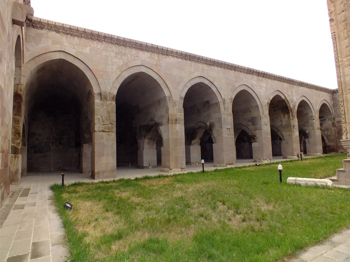 Dış surlarda kale görünümü veren 6 köşe kulesi ve 9 yan kulesi bulunmaktadır. Duvarlar çok ince kesilmiş kireçtaşından yapılmıştır ve bazı kısımlarında beyaz mermer bloklar bulunuyor. Duvarlarda değişik tasarımlardaki sade kuleler bulunuyor. binanın mimarisi Açık avlu ile örtülü bölüm Avludan daha küçük kapalı bölüm Orta nefli ve her iki tarafta 2 nefli kapalı bölüm 7 tonoz gözü şeklindedir.